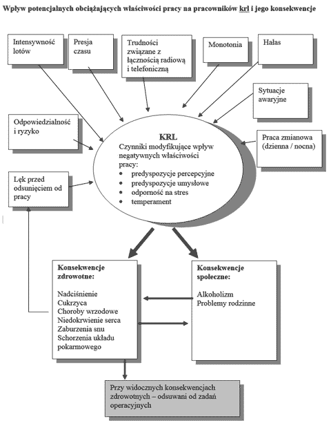Prezentowany rysunek uwzględnia jeszcze jeden ważny czynnik obciążający krl. a mianowicie lęk przed odsunięciem od pracy zawodowej. Lęk ten występuje u wszystkich osób bez względu na zawód, jednak u krl ma on specyficzny charakter. Krl większość swego życia zawodowego poświęcają na doskonalenie swoich umiejętności zawodowych; są to długie lata szkoleń i treningów. W momencie konieczności odsunięcia od zawodu - dalsze możliwości przekwalifikowania są bardzo ograniczone, a cały nakład pracy idzie na marne. Odsunięcie od zawodu może nastąpić nawet z powodu momentu nieuwagi lub z przyczyn zdrowotnych, na które nie ma wpływu. Co gorsze, często lęk jest jedną z przyczyn chorób serca, które po zdiagnozowaniu potęgują lęk przed utratą zawodu i tym samym mogą wpłynąć na nasilenie choroby.