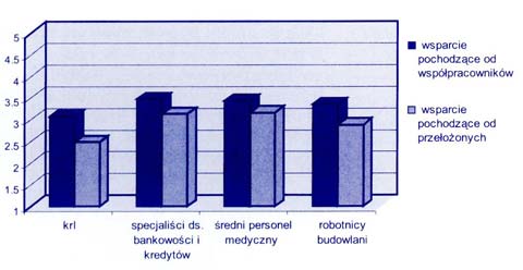 Skala Wsparcia Społecznego w Pracy pozwala na wyróżnienie wsparcia pochodzącego od przełożonych i od współpracowników. Kontrolerzy są bardziej wspierani przez współpracowników (3,07) niż przełożonych (2,49), ale jak pokazuje rys. 3, jest to typowe również dla innych grup zawodowych. W trakcie analizy nie stwierdzono jednak, czy różnice są istotne statystycznie. Dlatego można jedynie szacować wartości średnie.