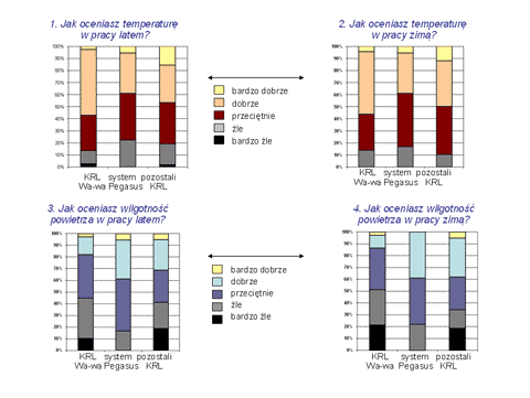 Wilgotność powietrza zarówno latem jak i zimą najgorzej ocenili kontrolerzy z Warszawy. Najwięcej ocen bardzo dobrych i najmniej bardzo złych wystawiły osoby pracujące na systemie Pegasus (grupa „system Pegasus”).
