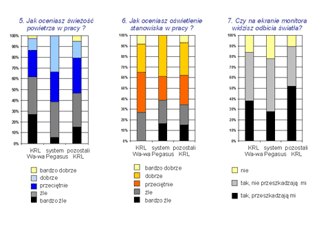 Oświetlenie stanowiska pracy oceniane jest z reguły pozytywnie (ok 40% ocen bardzo dobrych lub dobrych), jednak należy zwrócić uwagę iż ponad 80% kontrolerów widzi odbicia światła na ekranie, a ok 30-50% uważa, iż przeszkadzają one w pracy.