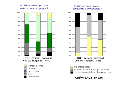 Statystycznie istotnie gorzej hałas został oceniony na stanowiskach pracy KRL w Warszawie, w porównaniu z pozostałymi lokalizacjami. Około 30% pracowników oceniło hałas źle lub bardzo źle i określiło iż stale przeszkadza on w ich pracy. Może wynikać to z faktu, że pracuje tu największa liczba kontrolerów w jednym pomieszczeniu. Stanowiska te nie mogą być umieszczone w kilku pomieszczeniach z uwagi na tryb racy i konieczność porozumiewania się między kontrolerami podczas pracy, szczególnie w sytuacjach awaryjnych. Jednocześnie nawet niewielki hałas wytwarzany przez każdego kontrolera w przypadku dużej liczny osób w pomieszczeniu jest kumulowany i może stanowić obciążenie. W przypadku pomieszczeń, w których pracują kontrolerzy zbliżania i obszaru, źródłami hałasu są pracujące non stop urządzenia klimatyzacyjne oraz zasilające obsługiwany sprzęt. Źródłem hałasu w pomieszczeniach przeznaczonych dla kontrolerów lotniska są startujące i lądujące samoloty.