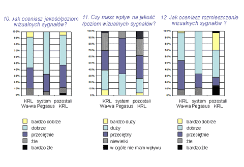 Jakość/poziom wizualnych sygnałów informacyjnych oceniane jest podobnie we wszystkich lokalizacjach i oceny te są z reguły (50-60%) dobre i bardzo dobre. Ich rozmieszczenie najlepiej oceniają kontrolerzy pracujący poza Warszawą.