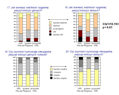 Ocena wygody kończyn dolnych w poszczególnych lokalizacjach wykazała iż statystycznie istotnie najgorzej pod tym względem oceniane są stanowiska pracy w Warszawie (grupa „KRL Wa-wa”). Możliwość przyjęcia wygodnej pozycji kończyn górnych oceniona została podobnie we wszystkich lokalizacjach. Kontrolerzy ocenili, że stanowiska bardzo rzadko lub tylko czasami wymuszają przyjęcie niewygodnych pozycji ciała.