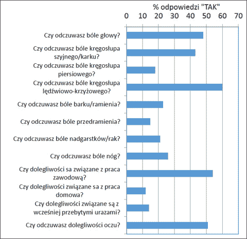 Kontrolerzy skarżą się szczególnie na dolegliwości kręgosłupa lędźwiowo-krzyżowego i głowy. Występowanie wszystkich zgłaszanych dolegliwości kontrolerzy wiążą częściej z pracą zawodową (ok 50-70%) niż z wykonywaniem czynnościami w domu.