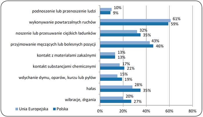 Otrzymane w ramach badania wyniki wskazują, że najczęściej pracownicy byli narażeni na wykonywanie powtarzalnych ruchów i wykonywanie pracy w męczącej lub bolesnej pozycji. Dotyczyło to zarówno zatrudnionych w Polsce, jak i w całej UE. Dużo niższy odsetek pracowników zgłaszał narażenie na substancje chemiczne i kontakt z materiałem zakaźnym. W większości przypadków odnotowany procent narażonych na poszczególne czynniki był w Polsce wyższy niż średnia w krajach unijnych, co zaprezentowano na rys. 1.