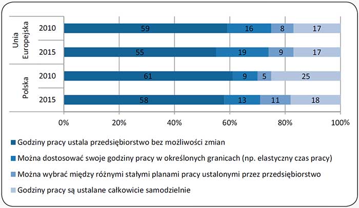 W odniesieniu do tego zagadnienia odpowiedzi zatrudnionych w Polsce wskazują, że 58% z nich miało ustalone przez pracodawcę godziny pracy, 13% deklarowało możliwość dostosowania godzin pracy w określonych granicach, 18% samodzielnie ustalało godziny pracy, a 11% mogło wybierać między różnymi planami pracy, ustalonymi przez pracodawcę. Wyniki uzyskane w Polsce nie odbiegają w tym przypadku od średnich wyników pracowników z innych państw UE.