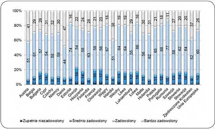 Pewnego rodzaju podsumowaniem badania EWCS było pytanie dotyczące stopnia zadowolenia z warunków, w których respondent wykonuje swoją główną pracę zarobkową. W państwach UE średnio aż 86% badanych było zadowolonych lub bardzo zadowolonych z warunków pracy (rys. 9.). Polska w tym zakresie nie odbiegła od średniej.