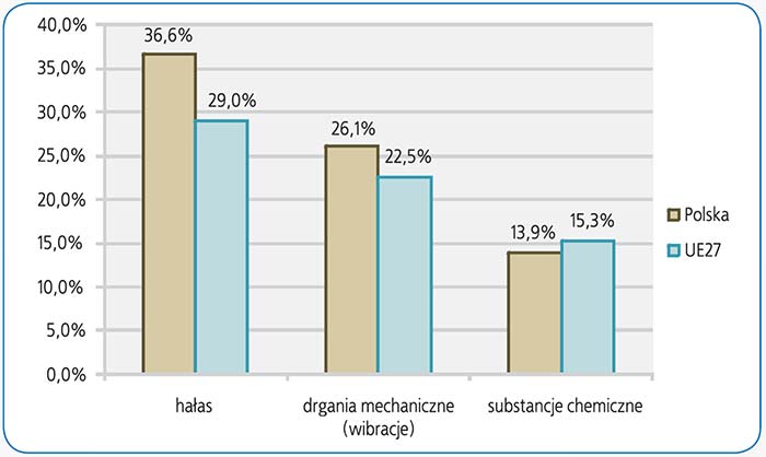 Rys. 1. Odsetek respondentów narażonych na hałas, drgania mechaniczne maszyn i urządzeń oraz narzędzi ręcznych, a także substancje chemiczne w miejscu pracy w Polsce i w UE27, EWCS 2010
