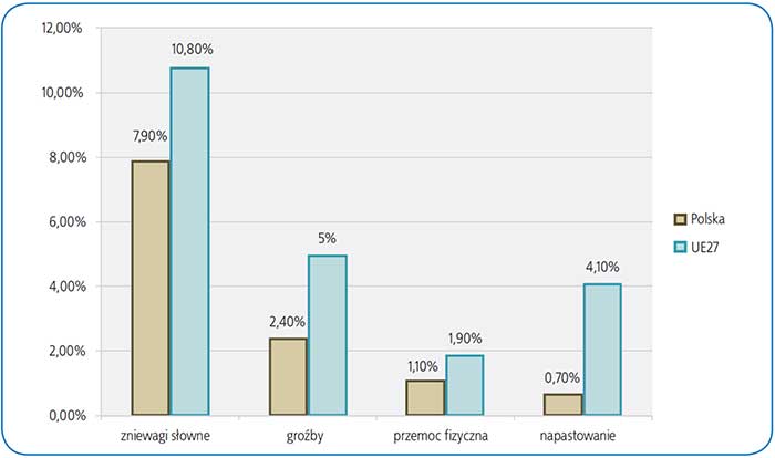 Najliczniejsza grupa badanych, zarówno w Polsce, jak w innych krajach europejskich, narażona jest na zniewagi słowne. Tego typu agresywnego zachowania doświadcza 8 na 100 badanych w Polsce i średnio niemal 11 na 100 w krajach UE. Ze znacznie mniejszą częstością doświadcza się w Polsce agresji w formie gróźb, przemocy fizycznej oraz tyranizowania i napastowania, przy czym warto zauważyć, że w każdym z wymienionych przypadków odsetek Polaków potwierdzających przejawy agresji w miejscu pracy jest niższy niż średni wśród badanych z krajów unijnych. (rys. 4.)