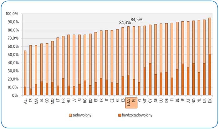 Z danych Fundacji wynika, że zdecydowana większość Europejczyków jest zadowolona z warunków, w jakich pracują. Niemal 85% badanych z krajów unijnych stwierdziło, że są bardzo zadowoleni lub zadowoleni z warunków pracy, w jakich wykonują swoją główną pracę zarobkową, przy czym odsetek Polaków usatysfakcjonowanych warunkami pracy jest porównywalny ze średnim odsetkiem dla krajów UE (rys. 5.).