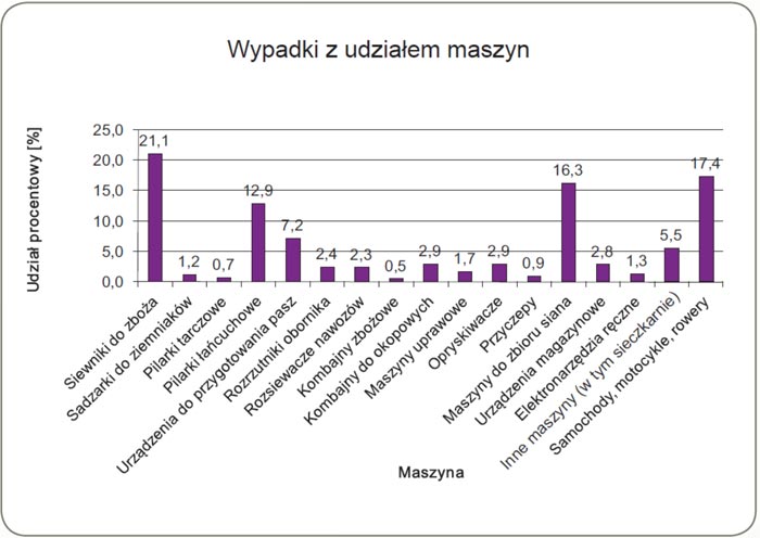 Istotne zagrożenie wypadkowe stanowiły pilarki łańcuchowe, maszyny do przygotowywania pasz dla zwierząt, kombajny do roślin okopowych, opryskiwacze, urządzenia i przenośniki magazynowe czy rozrzutniki obornika i rozsiewacze nawozów. Wypadki z udziałem maszyn uprawowych, elektronarzędzi i sadzarek do ziemniaków występowały rzadziej. Najrzadziej wystąpiły wypadki z udziałem pilarek tarczowych i kombajnów zbożowych, których skutki powypadkowe są zwykle ciężkie. Może to być spowodowane świadomością rolników co do zagrożeń wynikających z ich użycia.