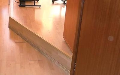 - śliskie lub nierówne podłoża: rozlane płyny i rozsypane drobne przedmioty (cukierki, kredki, śmieci itp.) oraz nieprzymocowane do podłoża, ślizgające się po nim chodniki i dywaniki; lód, śnieg, błoto oraz liście i żwir na zewnętrznych alejkach, a także nierówności, progi, stopnie schodów, podwyższenia (fot. 1.), ogrodzenia trawników i niezabezpieczone otwory studzienek kanalizacyjnych