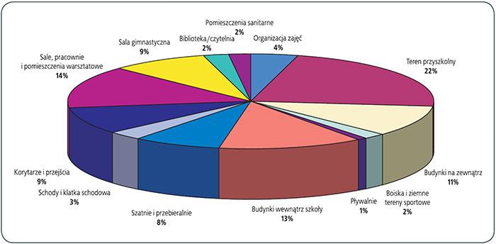 Wyniki przeprowadzonych przeglądów wykazały (rys.), że najwięcej „słabych punktów" występuje: na terenie przyszkolnym (22%), w salach, pracowniach i pomieszczeniach warsztatowych (14%) oraz w budynkach wewnątrz szkoły (13%).