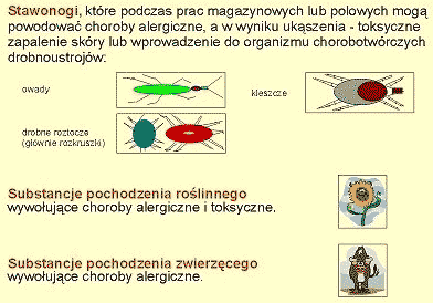 Duża liczba czynników biologicznych występujących w środowisku pracy wywiera na organizm ludzki działanie toksyczne, objawiające się najczęściej reakcją zapalną skóry (np. w wyniku działania toksycznych substancji pochodzących z niektórych roślin, wprowadzenia jadu w wyniku ukąszenia przez kleszcze lub niektóre drobne roztocze). Wdychane wraz z pyłem mikroorganizmy Mikroorganizmy