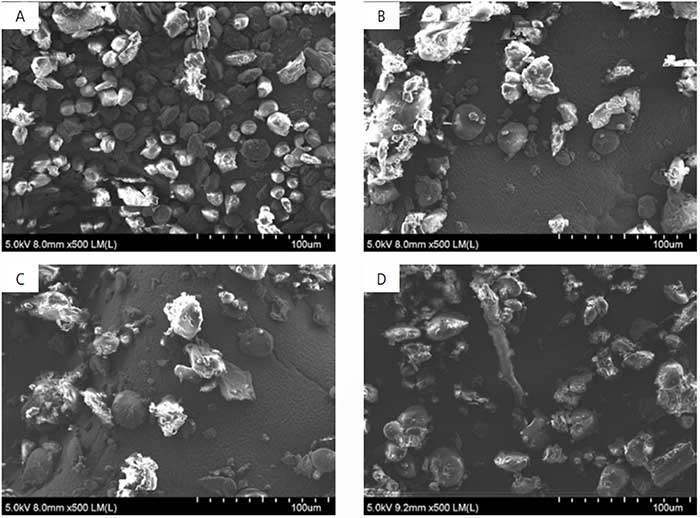 Rys. 2. Fotografie SEM ziaren po procesie mielenia: A-kukurydza; B-owies; C-pszenica; D-pszenżyto
