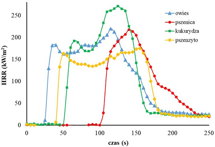 Zbożem o najkrótszym czasie zapłonu (28 sekund), jest owies. Na czas zapłonu może mieć wpływ m.in. wilgotność materiału, zawartość tłuszczu. Z kolei największą energetyczność podczas spalania, obliczaną na podstawie całkowitego wydzielonego ciepła wykazuje kukurydza, która jednocześnie osiąga najwyższe wartości parametrów związanych z szybkością wydzielania ciepła i wytwarzania największej ilość dymów. Kukurydza zawiera dużą ilość tłuszczów roślinnych, co ma wpływ zarówno na ilość ciepła, jak i na ilość dymów wydzielanych podczas spalania. Ilość ciepła wydzielonego w trakcie spalania kukurydzy niemal trzykrotnie przekracza wartości uzyskane w odniesieniu do pszenicy oraz pszenżyta. Podobna sytuacja ma miejsce jeśli chodzi o ilość wydzielanych dymów (rys. 3.).