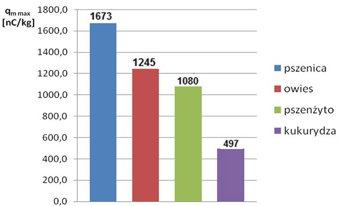 Rys. 5. Maksymalna wartość ładunku elektrostatycznego powstającego podczas zsypywania pyłów zbóż po podłożu stalowym (w odniesieniu do masy 1 kg materiału zsypowego)