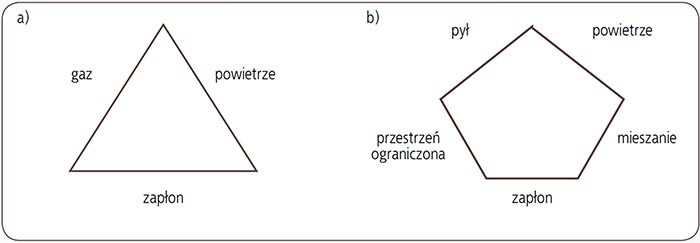 Rys. 1. Graficzna metoda prezentacji warunków, które muszą zostać spełnione jednocześnie, aby powstała swobodnie propagująca i samopodtrzymująca się reakcja spalania w: a) gazach i parach („trójkąt palności") oraz b) pyłach („pięciokąt wybuchowości"), [4]