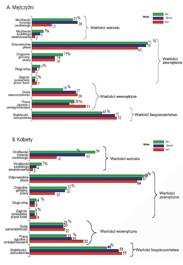 Polska Diagnoza Społeczna częściowo tylko potwierdza zarysowane wyżej tendencje. Rzeczywiście wartość „odpowiedniej płacy" jest stosunkowo mniejsza w odniesieniu do starszych pracowników (45+), niż wobec średniej oraz najmłodszej grupy wiekowej (rys.). Dwie ostatnie różnią się między sobą jedynie nieznacznie. Podobne tendencje można zauważyć odnośnie do innej wartości zewnętrznej, a mianowicie „dogodnych godzin pracy". Najstarsza grupa wiekowa stosunkowo najrzadziej ceni ten aspekt pracy. Natomiast inaczej wygląda sprawa z wartością uznania. W Diagnozie badano je pytaniem o znaczenie „zajęcia poważanego przez innych". Choć niewielu respondentów zaliczyło ten aspekt do najważniejszych, to jednak częściej zdarzało się to najstarszej grupie wiekowej, niż grupach średniej i najmłodszej.