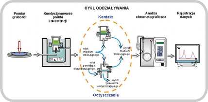 Podczas badań w warunkach kontaktu wielokrotnego, próbka badanego materiału jest kontaktowana z tą samą substancją chemiczną określoną liczbę cykli. W chwili napełnienia górnej komory celki po raz pierwszy badaną substancją, rozpoczynany jest pierwszy cykl kontaktu próbki z rozpuszczalnikiem. Po upływie ustalonego czasu kontaktu, substancja chemiczna jest usuwana z górnej komory celki przez jej obrót o 180 o i rozpoczynane jest oczyszczanie powierzchni próbki z pozostałości rozpuszczalnika, poprzez podłączenie przewodu z powietrzem oczyszczającym o określonym natężeniu przepływu. Po zakończeniu określonego czasu oczyszczania, dopływ powietrza oczyszczającego jest odcinany, celka ponownie jest obracana o kąt 180 o do pierwotnego położenia, a górna komora ponownie jest napełniana substancja chemiczną, rozpoczynając w ten sposób kolejny cykl kontaktu. Opisane czynności przeprowadzane są określoną liczbę cykli, zgodnie z wybranym wariantem metody wielokrotnego oddziaływania. Tak więc każdy cykl wielokrotnego oddziaływania składa się z:
