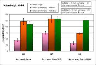 Materiały wytworzone z uwodornionego kauczuku butadienowo-akrylonitrylowego charakteryzowały się lepszymi właściwościami barierowymi w warunkach oddziaływania wielokrotnego niż w warunkach oddziaływania kontaktu ciągłego (Rys. 2).