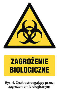 Pomieszczenia laboratoryjne BSL-2 należy w sposób wyraźny i widoczny oznakować poprzez umieszczenie na drzwiach znaku ostrzegającego przez zagrożeniem biologicznym (rys. 4).