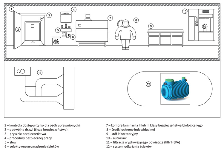 Laboratorium musi być całkowicie odizolowane od środowiska zewnętrznego. W tym celu stosuje się bariery ochronne (śluzy na wejściu/wyjściu) oraz wentylację mechaniczną. Wymagane jest podciśnienie oraz przepuszczanie powietrza dostarczanego do laboratorium i wydostającego się z niego przez wysokosprawne filtry. Konieczne są następujące ŚOI: dwie pary rękawic odpornych na działanie czynników biologicznych, kombinezon ochronny, zarękawki, sprzęt ochrony układu oddechowego (półmaski filtrujące FFP3) oraz okulary lub gogle laboratoryjne. Wszystkie elementy ŚOI należy traktować jako jednorazowego użytku i po skończonej pracy gromadzić selektywnie oraz utylizować jak odpady medyczne [7, 17].
