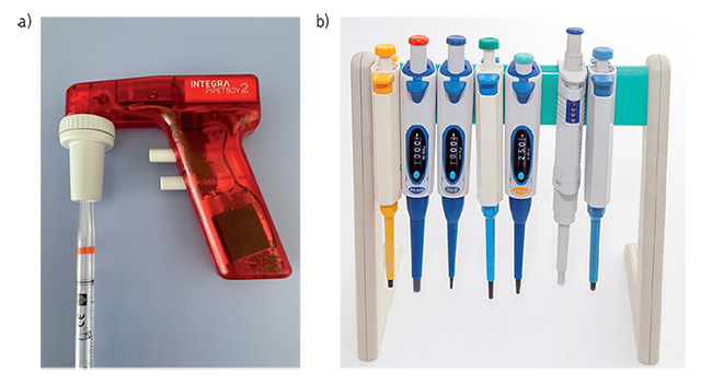 Rys. 1. Pipetor (a) i pipety automatyczne (b)