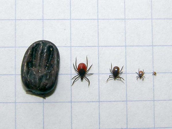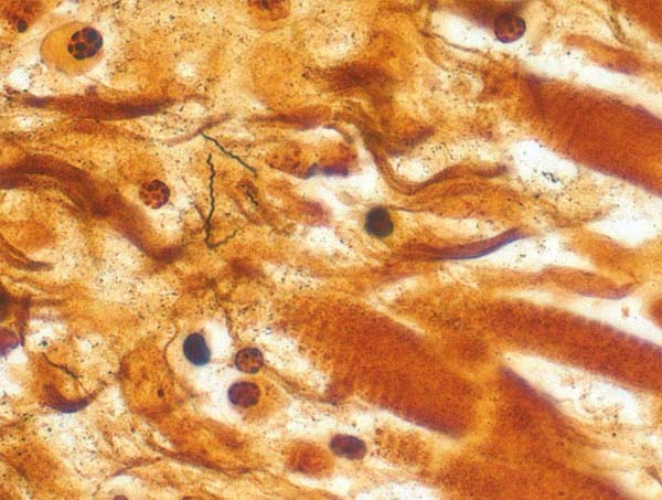 | Fot. 1. Stadia rozwojowe kleszcza Ixodes ricinus. Od lewej: napita krwią samica, głodna samica, samiec, nimfa, larwa | Fot. 2. Krętki Borrelia burgdorferi w mięśniu sercowym. Centers for Disease Control and Prevention |