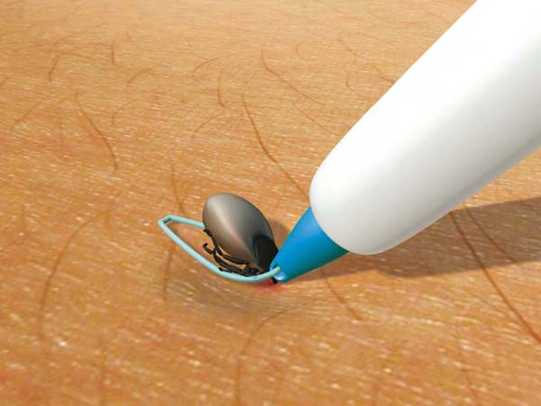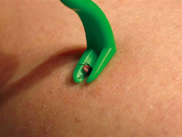Do usuwania kleszcza najlepiej posłużyć się pęsetą lub innymi dostępnymi na rynku przyrządami do usuwania kleszczy, takimi jak: miniaturowa pompka podciśnieniowa, przyrząd działający na zasadzie lassa (fot. 3.), lub prosty i tani przyrząd w kształcie haczyka, dostępny w Polsce pod nazwą „kleszczołapka” (fot. 4.).Za pomocą tego przyrządu można usuwać zarówno formy dojrzałe kleszczy, jak i nimfy. Należy unikać często spotykanego wśród pracowników leśnictwa wyciągania kleszcza palcami, gdyż może to doprowadzić do rozerwania pajęczaka i przedłużenia ryzyka infekcji.