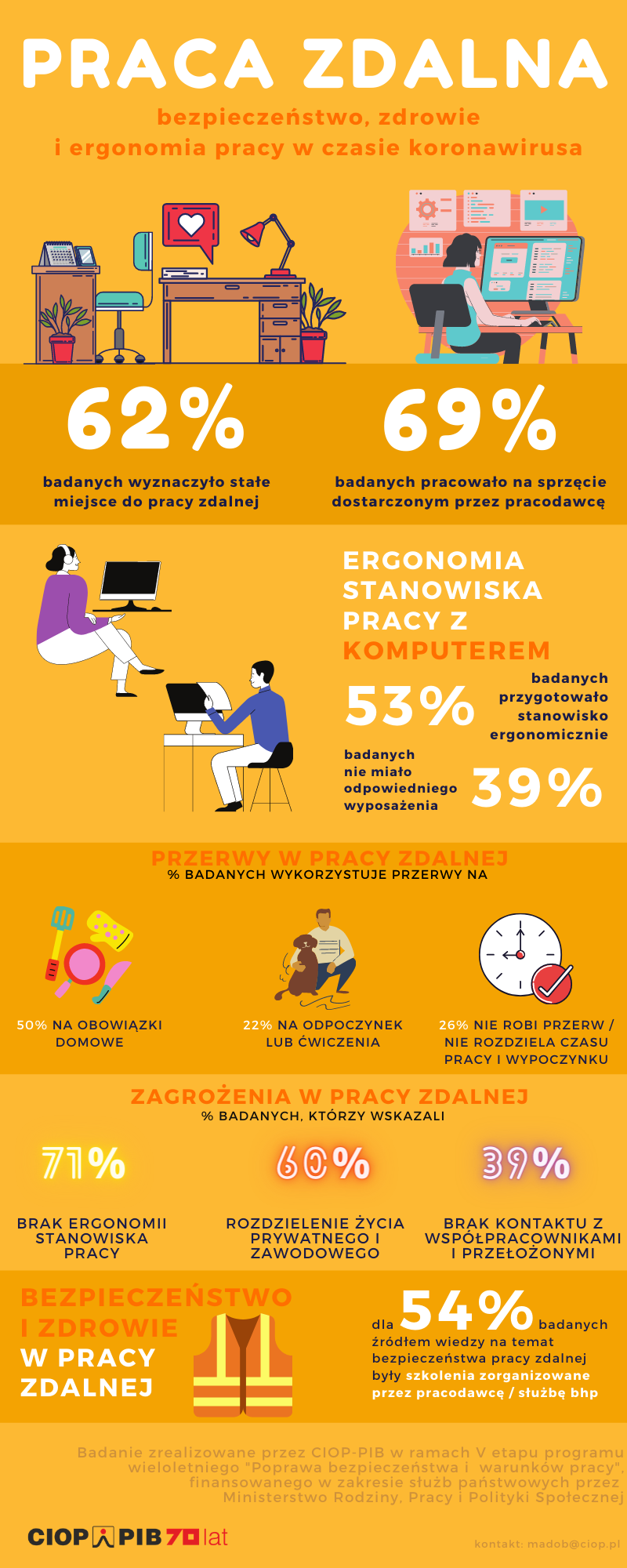 Jak pracujący zdalnie radzą sobie ze stworzeniem miejsca pracy i zadbanie o zdrowie i bezpieczeństwo? Jak zmieniło się wykonywanie pracy po przejściu na pracę zdalną – środowisko i miejsce pracy? Jak oceniają swoją wiedzę i umiejętności potrzebne do zorganizowania bezpiecznego stanowiska pracy i wspierających zachowanie zdrowia? Czy pracodawcy (przez działania z zakresu bhp) dostarczyli pracownikom taką wiedzę i umiejętności? A może pracownicy szukają jej na własną rękę?