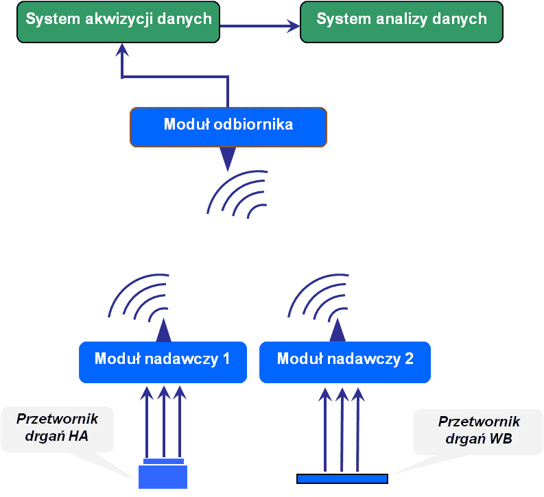 Rys. 3. Schemat układu do pomiarów i analizy drgań z bezprzewodowym systemem akwizycji danych