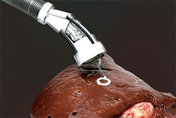 Miniaturowa elastyczna biodrukarka 3D opracowana w UNSW Sydney podczas wykonywania druku 3D na powierzchni nerki świni (fot. dr Thanh Nho Do)