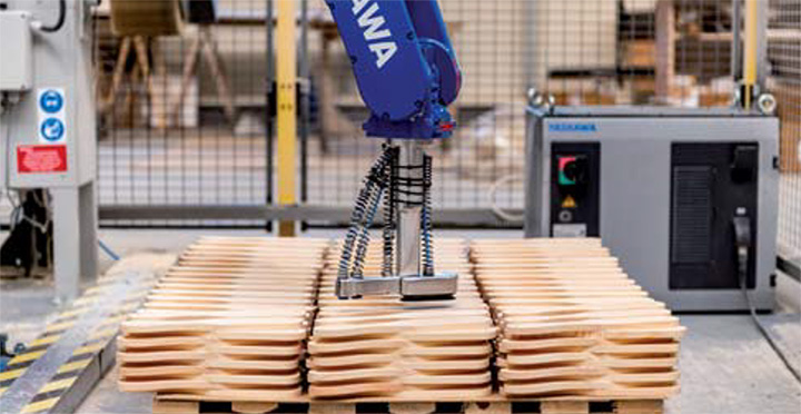 Choć proces produkcji przedmiotów branży stolarskiej nadal w dużej mierze polega na pracy ręcznej, to firmy coraz częściej decydują się na wprowadzenie robotów, które wyróżnia imponująca precyzja i powtarzalność. W ten sposób redukuje się poziom błędów, co przynosi jeszcze większe korzyści w zakresie wydajności i jakości oraz stanowi ważny czynnik w zwiększaniu konkurencyjności. Jednym z przykładów przedsiębiorstw z branży stolarskiej, które zdecydowały się na automatyzację procesu produkcji, jest firma Dobry Stolarz. Zadaniem postawionym przed integratorem było usprawnienie procesu szlifowania elementów z drewna. Produkcja w branży stolarskiej często jest pracochłonna, monotonna i wymagająca pod względem fizycznym. Automatyzacji poddano więc czynności, w trakcie których wykonuje się wiele ruchów i następuje przekładanie elementu, a mianowicie: ręczną obróbkę na szlifierce i polerce oraz gratowanie. Proces, do którego potrzebne było wdrożenie robota, charakteryzował się wysokim stopniem monotonności, był wykonywany ok. 500-600 razy w ciągu zmiany i polegał na obróceniu niewielkiego detalu drewnianego na ściernicy listkowej. Na stanowisku do obróbki elementów drewnianych wdrożono robota przemysłowego, który dokładnie odwzorowywał ruchy i podniósł wydajność procesu. Pracownicy mogli zostać oddelegowani na inne stanowiska4.