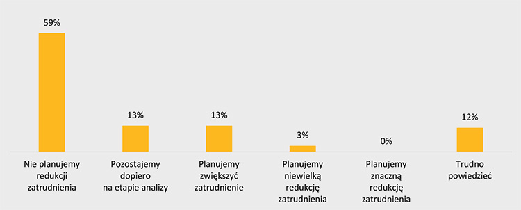 W perspektywie dwóch najbliższych lat 59% ankietowanych firm nie rozważa żadnej redukcji zatrudnienia wynikającej z rozwoju sztucznej inteligencji, a 13% wręcz planuje zwiększenie liczebności załogi. Jednak dokładnie ten sam odsetek firm (13%) zaznacza, że obecnie znajduje się na etapie analizy dotyczącej możliwych zmian wynikających z rozwoju narzędzi wykorzystujących sztuczną inteligencję. Należy się jednak spodziewać, że w kolejnych miesiącach ten odsetek się zwiększy. Zapytani o możliwy rozwój sytuacji na rynku pracy respondenci wskazywali, że najbardziej narażone na zastąpienie przez rozwój sztucznej inteligencji są osoby związane z obsługą klienta (37%), produkcją przemysłową (32%) oraz branżą marketingu i komunikacji (22%).