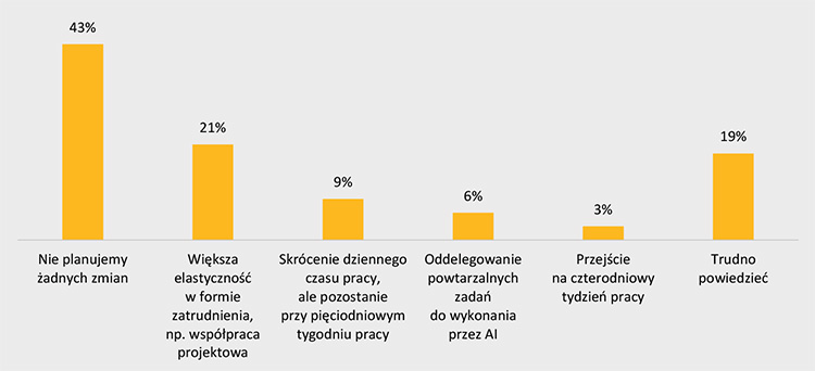 W badaniu potwierdzono, że rozwój narzędzi wykorzystujących rozwiązania sztucznej inteligencji nie ma obecnie znaczącego wpływu na modele operacyjne w polskich przedsiębiorstwach. Aż 43% ankietowanych firm nie planuje żadnych zmian w tym obszarze, a kolejne 19% ma niesprecyzowan ą opinię. Wśród organizacji, które planują podjęcie konkretnych działań, najwięcej (21%) zdecydowałoby się na wprowadzenie większej elastyczności w formie zatrudnienia – np. współpracy na zasadach projektowych. Bardziej zaawansowane rozwiązania, takie jak oddelegowanie powtarzalnych zadań do wykonania przez sztuczną inteligencję (6%), skrócenie dziennego czasu pracy (9%) lub przejście na czterodniowy tydzień pracy (3%) wskazuje znikomy odsetek badanych organizacji.