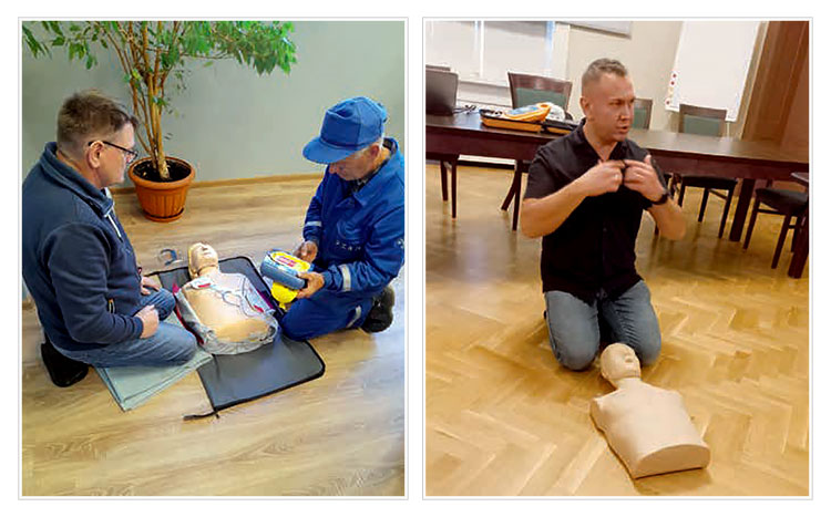 Szkolenie z udzielania pierwszej pomocy zorganizowane dla pracowników przez firmę PERN w Woli Rzędzińskiej (po lewej) oraz Park Naukowo-Technologiczny Uniwersytetu Zielonogórskiego (po prawej)