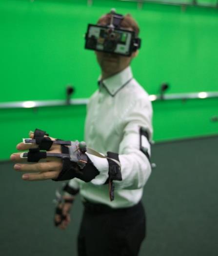 | Rysunek 1. Bezprzewodowa gogle VR wykorzystywane w Laboratorium Zanurzeniowej Rzeczywistości Wirtualnej CIOP-PIB | Rysunek 2. Bezprzewodowa rękawica VR wykorzystywana w Laboratorium Zanurzeniowej Rzeczywistości Wirtualnej CIOP-PIB. |