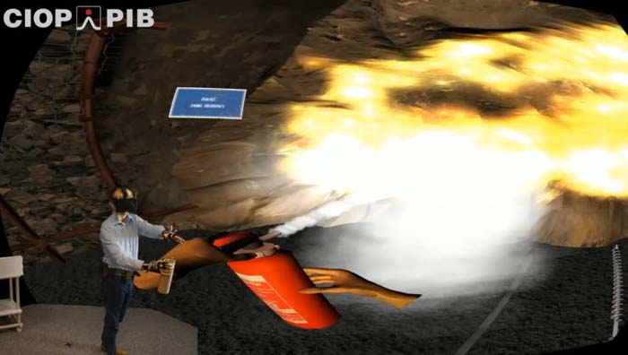 | Rysunek 3. Przykład wdrożonej wirtualnej symulacji szkoleniowej obejmującej w swym zakresie m.in. gaszenia płonącej ścianki przodka w podziemnej kopalni węgla kamiennego. W symulacji wykorzystana jest atrapa rzeczywistego obiektu (gaśnicy) | Rysunek 4. Przykład jednego z wielu środowisk wirtualnych dotyczących kopalni podziemnych zrealizowanych przez CIOP-PIB. |