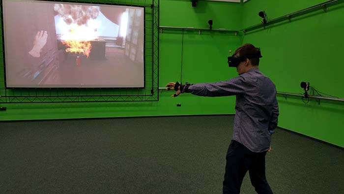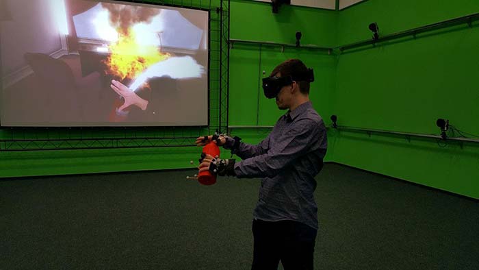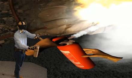 Rysunek 6. Przykład interakcji z wirtualnym środowiskiem – gaszenie wirtualnego pożaru z wykorzystaniem atrapy gaśnicy. |