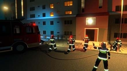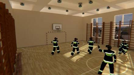 Kompleksowy system szkoleniowy bazujący na technikach rzeczywistości wirtualnej pozwala na tworzenie dowolnych nowych scenariuszy szkoleniowych z jednoczesnym udziałem wielu osób, w szczególności dowódcy, który będzie kierował działaniami całej grupy pracowników (np. strażaków lub ratowników). Wizualizacja przykładowych scenariuszy, które mogą być zrealizowane przedstawia Rysunek 7. Ponieważ odpowiednio rozbudowany system rejestruje ruchy całego ciała, osoby zanurzone w środowisku wirtualnym będą mogły obserwować nie tylko wirtualne środowisko ale też ruchy innych osób biorących udział w tej samej symulacji. Ponadto dowódca będzie mógł wydawać polecenia nie tylko za pomocą głosu, ale też i gestów, gdyż monitorowany będzie również ruch palców (Rysunek 7).