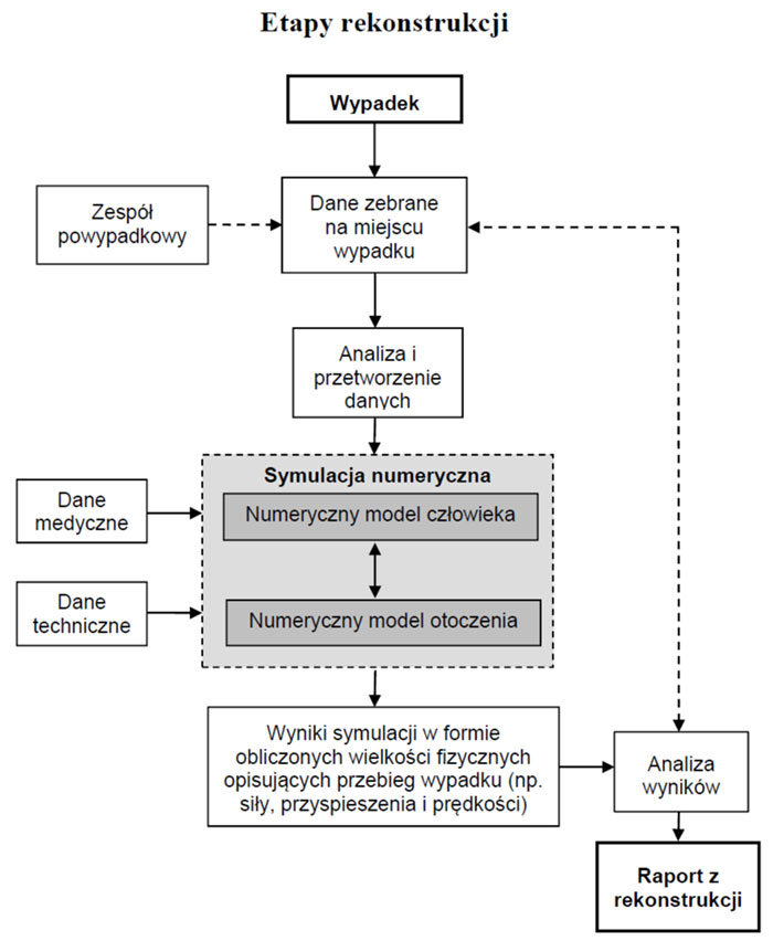 Centralny Instytut Ochrony Pracy – Państwowy Instytut Badawczy jest jednym z nielicznych ośrodków na świecie, który prowadzi rekonstrukcje wypadków przy pracy z wykorzystaniem symulacji numerycznej. Do tego celu wykorzystywany jest pakiet Madymo firmy TASS International, który jest jednym z najbardziej zaawansowanych programów służących do rekonstrukcji wypadków. Dzięki wykorzystaniu zaawansowanych równań matematycznych, oprogramowanie to umożliwia modelowanie kinematyki i dynamiki ciała człowieka oraz innych obiektów fizycznych. Wraz z oprogramowaniem stosowany jest numeryczny model człowieka, który umożliwia m.in. obliczanie wielkości fizycznych takich jak przyspieszenia, siły oraz momenty sił poszczególnych części ciała. Na tej podstawie możliwe jest dokonanie oceny prawdopodobieństwa wystąpienia urazów spowodowanych wypadkiem np. urazów głowy osłoniętej przemysłowym hełmem ochronnym (model głowy z hełmem opracowano w CIOP-PIB) oraz złamania kończyn górnych i dolnych (model kończyn górnych opracowano w CIOP-PIB).