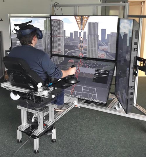 Źródło: Materiały informacyjne CIOP-PIB pt. "Laboratoryjna wersja symulatora żurawia wieżowego z platformą obrotową do prowadzenia szkoleń operatorów żurawi", 2019