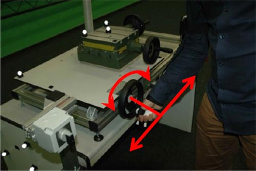 Dużą zaletą stosowania rękawic VR ze sprzężeniem zwrotnym w symulacji procesu pracy (użytkowanie wirtualnej maszyny) jest możliwość swobodnego obejmowania, podnoszenia i przemieszczania wirtualnych obiektów w środowisku bez konieczności stosowania ich rzeczywistych odpowiedników. Objęcie lub podniesienie wirtualnego elementu pozwala użytkownikowi na odczuwanie trzymania go w dłoni i manipulowanie nim w środowisku, np. w celu zamontowania go w uchwycie maszyny. Niestety rozwiązanie to ma wadę, jest to brak możliwości odczuwania ciężaru podnoszonego elementu, co oczywiście nie ma miejsca w przypadku zastosowania rzeczywistego obiektu. Należy jednak pamiętać o dokładnym go odwzorowaniu w środowisku wirtualnym (zachowując odpowiedni kształt i gabaryty). Powinna być również przeprowadzona właściwa synchronizacja pomiędzy tym obiektem, a jego wirtualnym odpowiednikiem. Rękawica VR powinna być również wspierana przez rzeczywiste elementy sterownicze przy niektórych czynnościach związanych ze sterowaniem maszyną. Do takich sytuacji może dojść w przypadku, gdy dany element sterowniczy zmienia swoje położenie podczas użytkowania, tzn. przemieszcza się wraz z elementem maszyny. Przykład przemieszczającego się stołu maszyny z zamontowanym pokrętłem sterowniczym przedstawiono na rysunku 5.
