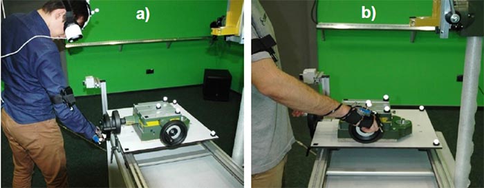 Czynnikiem wpływającym na precyzję sterowania i umożliwiającym swobodne wykonanie zadania na symulatorze przy zastosowaniu rękawicy z siłowym sprzężeniem zwrotnym jest sposób umieszczenia elementu sterowniczego. Umieszczenie elementów równolegle do użytkownika (rysunek 6.a) pozwala na wykonywanie zadań w sposób prosty i niestwarzający problemów uczestnikom.