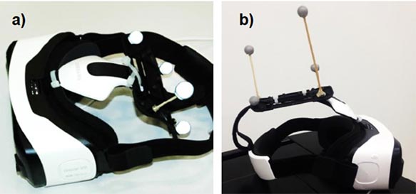 W przypadku stosowania systemu wizyjnego (zestawu kamer) i znaczników refleksyjnych należy zwrócić uwagę, aby były one odpowiednio rozmieszczone na dłoni, na głowie lub innych strefach niezbędnych do prowadzenia symulacji. Podczas prowadzonych badań zaobserwowano samorzutne obracanie się obrazu o 180 stopni wokół osi optycznej wirtualnej kamery. Nieprawidłowość ta była wynikiem umieszczenia na goglach znaczników w jednej płaszczyźnie (rysunek 7.a), przez co system śledzenia obiektów zawsze miał dwie możliwości wyznaczenia orientacji głowy (brak wektora normalnego do umownie przyjętej płaszczyzny wyznaczającej orientację gogli VR w rzeczywistej przestrzeni). Zainstalowanie znaczników w układzie geometrycznie, zbliżonym do czworościanu, zlikwidowało ten problem. Innym sposobem jest odseparowanie (rysunek 7.b) znaczników, co znacznie obniżyło amplitudę drgań kątowych wzorca i poprawiło stabilność obrazu. Innym elementem mogącym powodować obrót obrazu w goglach VR może być umieszczenie metalowego przedmiotu w pobliżu urządzeń (np. żyroskopu) odpowiedzialnych za orientację w środowisku. W tym przypadku wystarczy odsunąć lub osłonić elementy metalowe, co spowoduje ustąpienie tej nieprawidłowości.