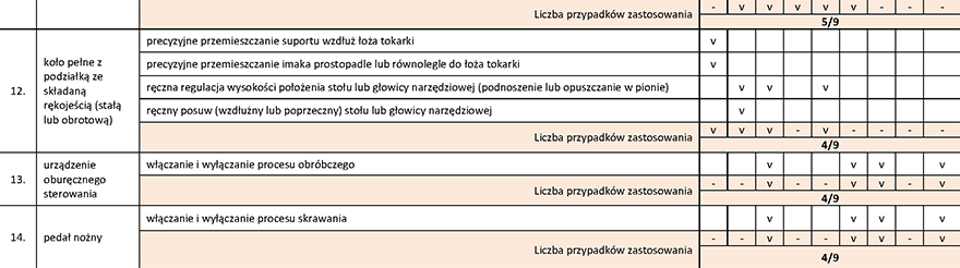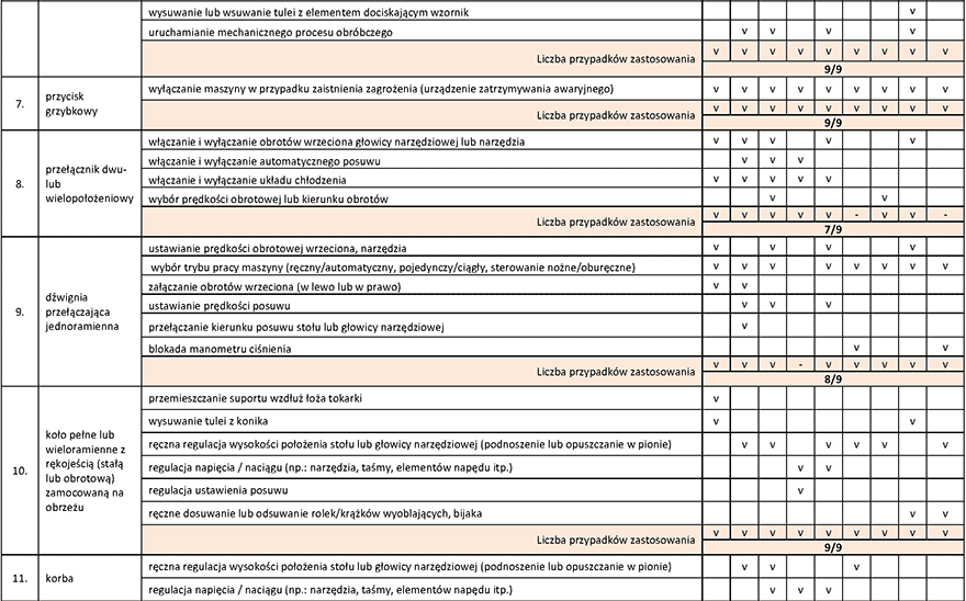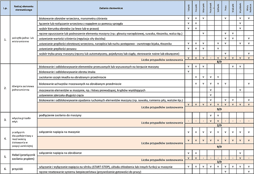 Tabela 1. Zestawienie elementów sterowniczych oraz ich typowe zastosowanie w odniesieniu do użytkowanych maszyn do obróbki metalu