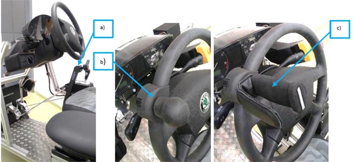 Rys. 2. Oprzyrządowanie adaptacyjne: a) urządzeniem do ręcznego sterowania gazem i hamulcem RGH V polskiej firmy CEBRON Sp. z o. o., b) uchwyt kierownicy – gałka na kierownicę, c) uchwyt kierownicy – dwupinowy (aut. Jarosław Jankowski)