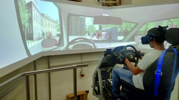 Celem realizowanego w CIOP-PIB zadania 2.G.18 było opracowanie nowych narzędzi wspomagających zapobieganie wykluczeniu społecznemu osób z niepełnosprawnościami (dysfunkcja narządu ruchu i/lub ubytek słuchu) o zróżnicowanej etiologii, zarówno wrodzonymi, jak i nabytymi. W ramach zadania powstał symulator jazdy dla osób niepełnosprawnych wykorzystujący techniki rzeczywistości wirtualnej. Składa się on z uproszczonego kokpitu samochodu wyposażonego w wybrane urządzenia adaptacyjne umożliwiające osobom z niepełnosprawnościami prowadzenie wirtualnego samochodu. Jest to samochód w klasie do 3,5 tony dmc typu minivan z automatyczną skrzynią biegów. W celu zwiększenia realizmu symulacji kokpit umieszczono na ruchomej platformie o sześciu stopniach swobody. Symulacja jazdy może się odbywać z wykorzystaniem gogli – stereoskopowych okularów projekcyjnych (ang. Head Mounted Display) lub projekcji ekranowej wykorzystującej trzy ekrany. Opracowana aplikacja symulatora zawiera wirtualne środowisko (rys. 1), które umożliwia jazdę w terenie miejskim oraz niezabudowanym, wyposażone w różnego typu drogi, sygnalizację świetlną, autonomicznie poruszające się samochody oraz awatary ludzi. Osoby na wózkach inwalidzkich mają możliwość skorzystania z symulatora dzięki przystosowanemu do ich potrzeb podestowi.