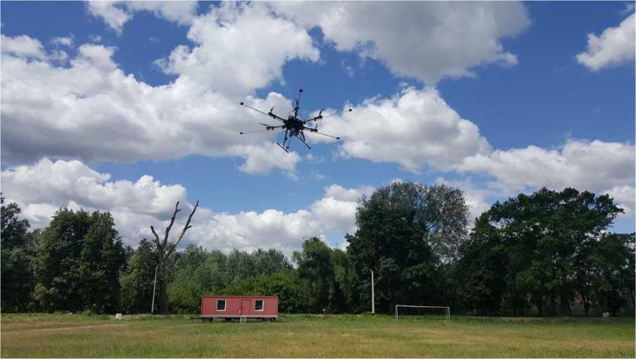 Fot. 9. Bezzałogowy statek latający (UAV) z wysuniętymi ramionami zawierającymi moduły pomiarowe